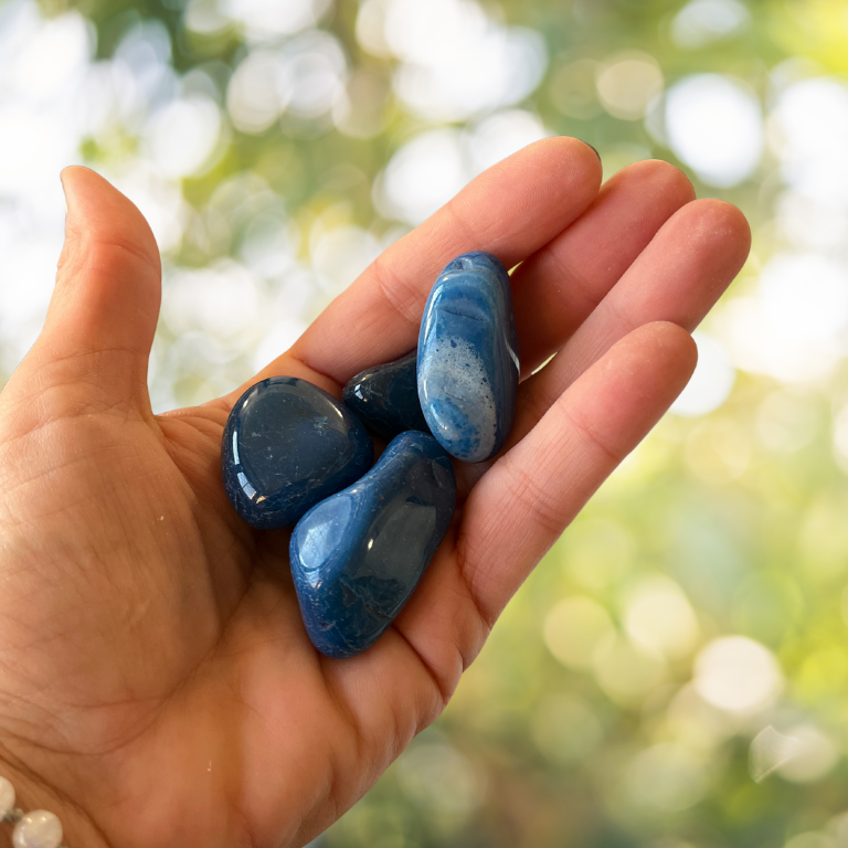 L’Agata Blu è associata al chakra della gola e sostiene l’espressione autentica, la calma interiore e la comunicazione empatica. È una pietra che aiuta a sciogliere i nodi emotivi e ad alleviare le tensioni, favorendo equilibrio e centratura nei momenti difficili. Portarla con sé può rafforzare la fiducia in sé stessi e la capacità di ascolto.