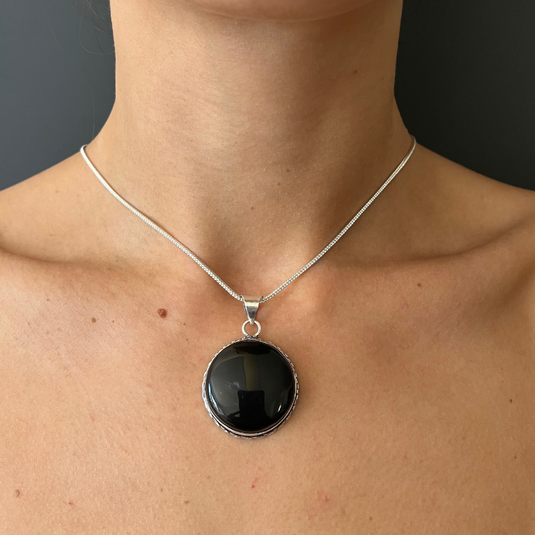 Scopri i nostri ciondoli in Onice Nero naturale, perfetti per chi cerca un gioiello elegante e allo stesso tempo carico di significato. Ogni ciondolo è unico, montato su base in ottone placcato in argento.