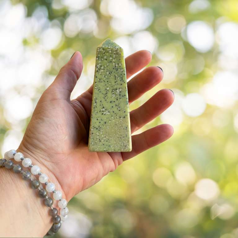 Questa torre in Serpentino, con le sue tonalità verdi punteggiate di inclusioni naturali, è un potente simbolo di trasformazione e rigenerazione. Conosciuta per la sua capacità di favorire il rinnovamento interiore, la pietra Serpentino aiuta a sciogliere vecchi blocchi emotivi, promuovendo equilibrio e serenità.