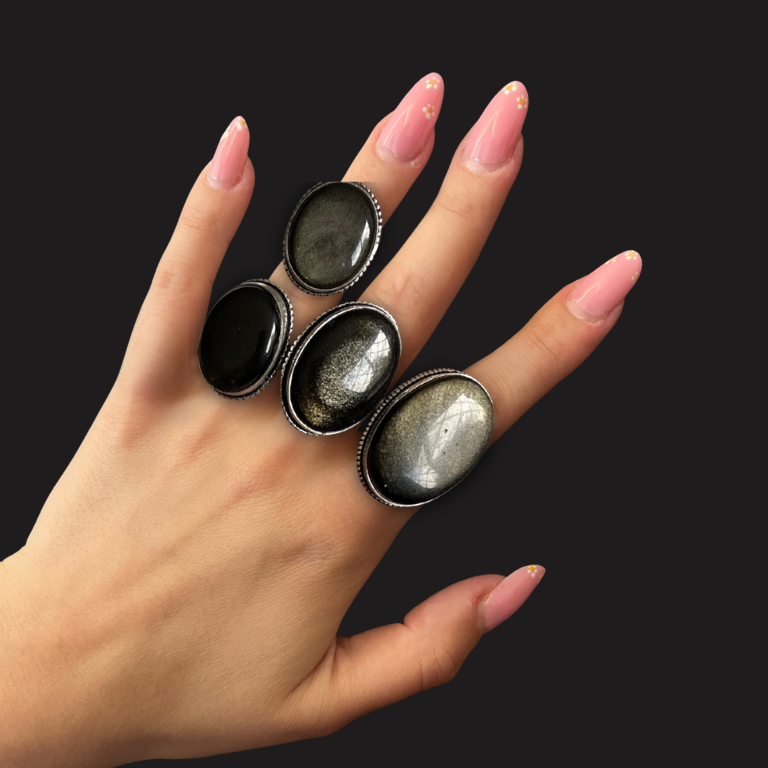 Scopri il fascino intenso dell’Ossidiana Dorata, pietra di radicamento e protezione profonda. Questo anello è realizzato in ottone placcato in argento 925, con una finitura elegante e luminosa, che ne esalta la forma e i riflessi dorati della pietra.