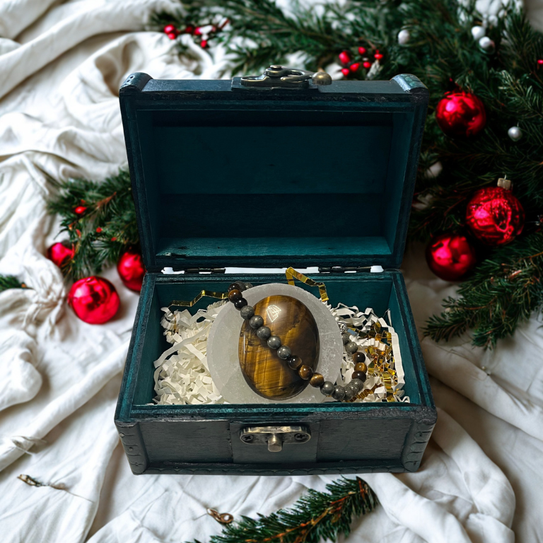 Questa box contiene un anello/bracciale in Occhio di Tigre e Pirite, unito a una palmstone di Occhio di Tigre, per creare un flusso energetico equilibrato tra protezione, determinazione e realizzazione pratica.