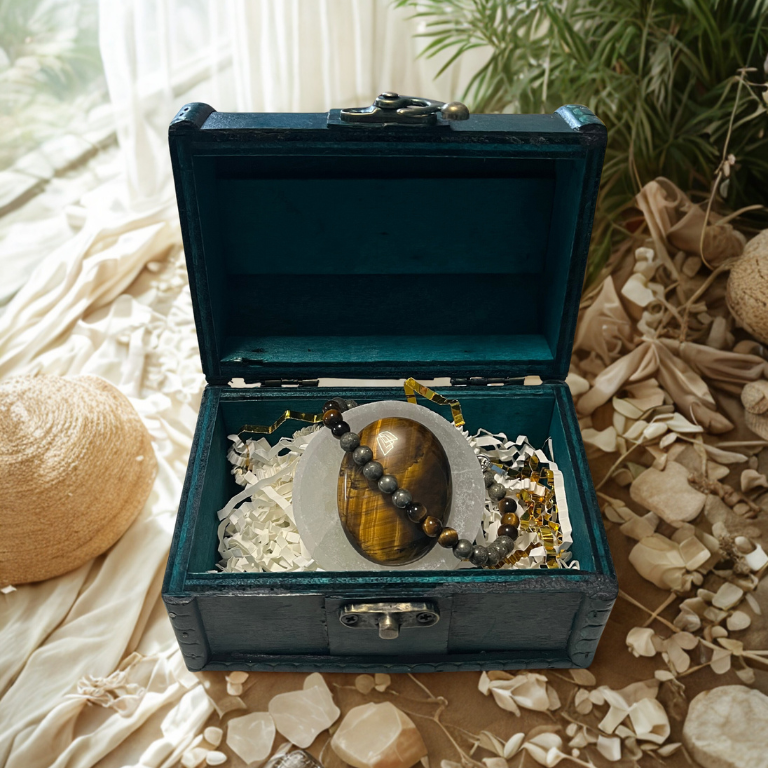 Forziere Occhio di Tigre e Piattino Selenite – Coraggio e Realizzazione Personale