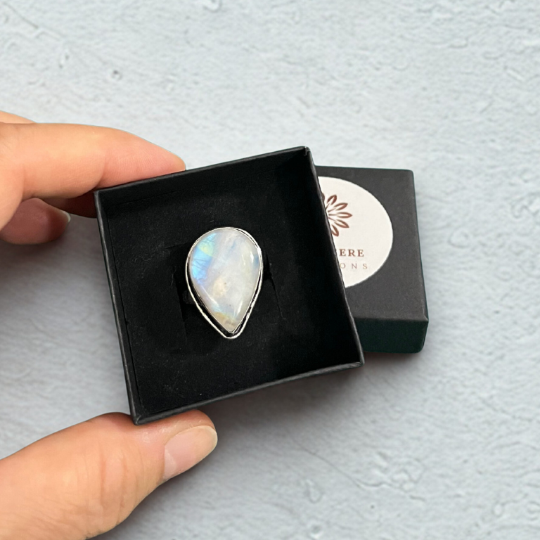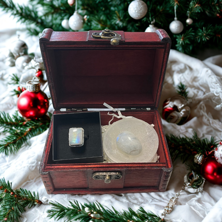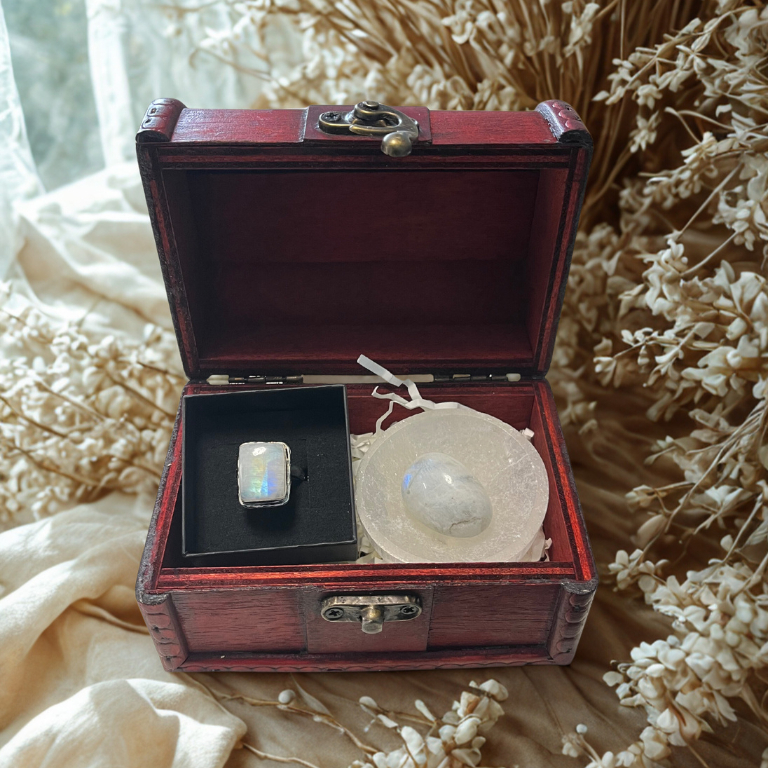 Questa box unisce un anello regolabile in pietra di luna, elegante e versatile, a una pietra di luna arcobaleno burattata, perfetta per meditazione, introspezione o come amuleto quotidiano.