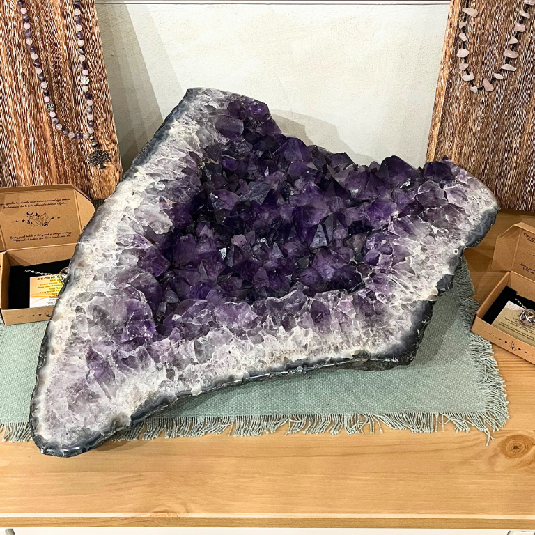La struttura è ampia, stabile e armoniosa, con cristalli ben formati che esprimono una tonalità viola intensa e naturale. Oggetti di queste dimensioni e qualità non sono semplici elementi decorativi, ma vere presenze energetiche, capaci di influenzare in modo duraturo l’atmosfera di uno spazio.