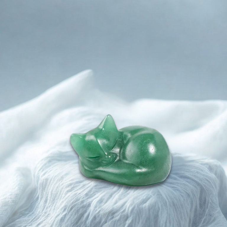 Questo piccolo gattino, scolpito con cura nell’avventurina verde, è molto più di un semplice oggetto decorativo: è un portafortuna che emana calma, equilibrio e speranza.