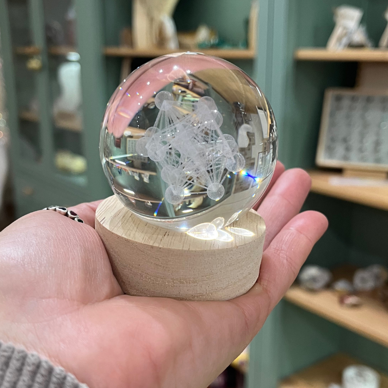 All’interno della sfera è inciso al laser il Cubo di Metatron oppure il Fiore della Vita, due simboli antichi che rappresentano l’ordine dell’universo, l’armonia e la connessione tra tutte le forme di vita.