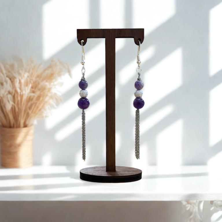 Le sfere di ametista, dal viola intenso e luminoso, sono abbinate a dettagli in argento e a una sottile catenella pendente che dona leggerezza e verticalità, valorizzando il viso con discrezione.