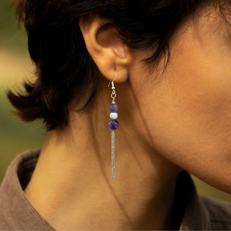 Questi orecchini in Ametista naturale con monachella in argento uniscono essenzialità e movimento in un gioiello delicato ma ricco di significato.