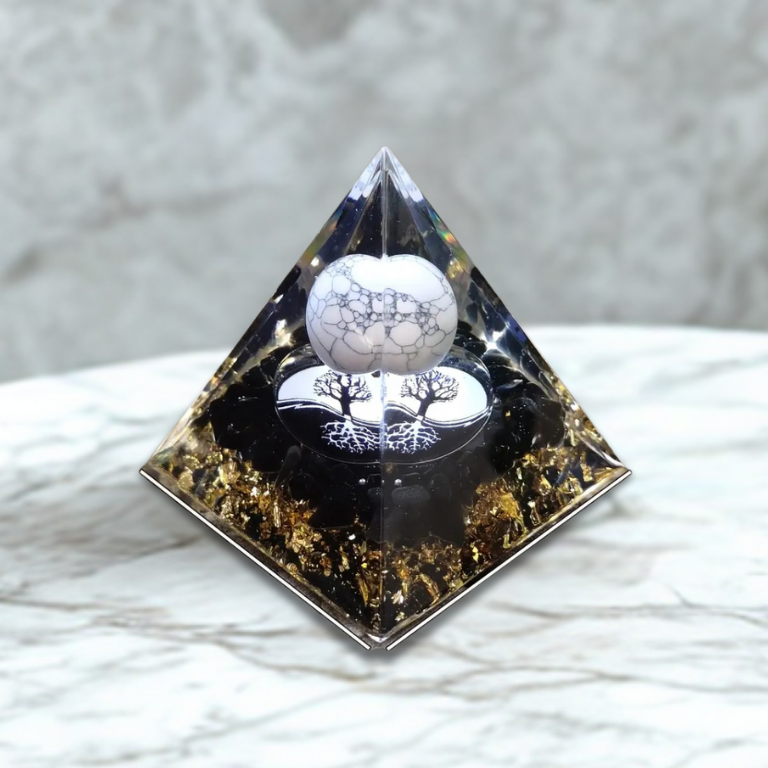 Una potente combinazione energetica racchiusa in una piramide compatta: l’Howlite, pietra della calma interiore, si unisce alla forza protettiva dell’Ossidiana. Il simbolo dell’Albero della Vita amplifica il potere di radicamento e trasformazione.